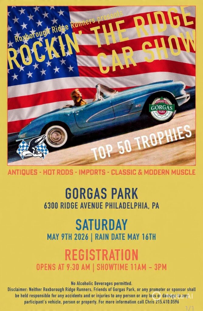 Celebrate the birth of our nation with the Roxborough Ridge Runners at the Red White and Blue Rockin’ the Ridge Car Show. Enjoy classic cars, vintage trucks, and American muscle alongside a live DJ, great music from a live band, exciting door prizes, and custom car show trophies—all set against a backdrop of red, white, and blue community pride at beautiful Gorgas Park.